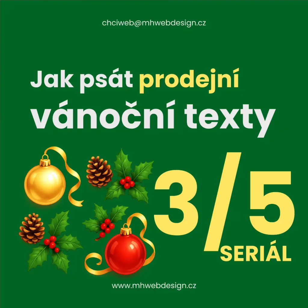 Třetí díl vánočního seriálu MH Webdesign Vás naučí psát vánoční texty, které opravdu prodávají. Spojte emoce, SEO a prodejní argumenty do copywritingu, který promění návštěvníka v zákazníka.